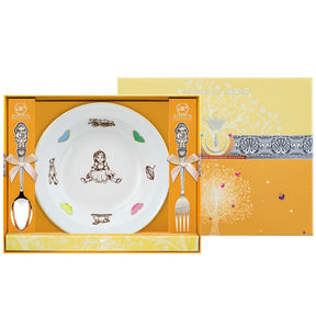 Edles Porzellanset ist ein einzigartiges Geschenk-Set für Kleinkinder bestehend aus einem Silberbesteck (Silberlöffel, Silbergabel) schönem Porzellanteller mit coolen Motiven wie Pupen und Kinderspielzeugen.