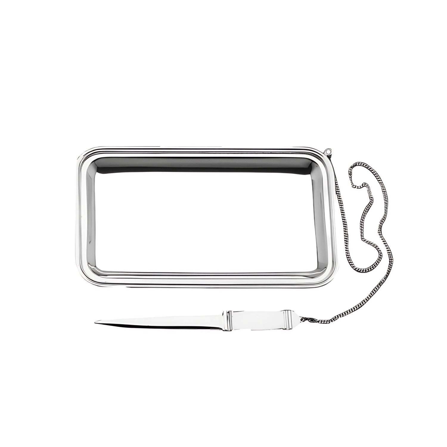 Die Briefablage ist rechteckig mit abgerundeten Ecken und erhöhtem Rand — hochglanzpoliert, 25 × 15 cm, massiv aus 925er Sterling Silber gegossen. Der Brieföffner hat einen geraden, schlanken Griff mit leichter Taille und eine Klinge, die Umschläge sauber öffnet. Beide Teile sind über eine geflochtene Silberkette miteinander verbunden — ein Detail, das das Set als Einheit zusammenhält und verhindert, dass der Brieföffner im Schreibtischchaos verschwindet.
