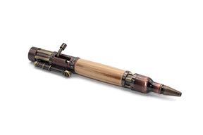 Einzigartiger handgemachter Kugelschreiber aus stabilisiertem Apfelholz gedrechselt in GUN-Stil. Die Kugelschreiber-Hardware wiederholt den Maschinengewehrmechanismus, der die Stange in ihre Arbeitsposition bringt.