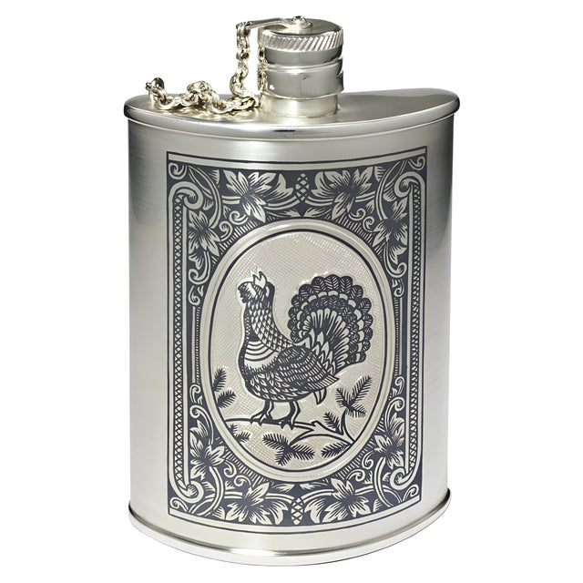 Das Auerwild ist ein scheuer und unauffälliger Waldbewohner. Aber dennoch gibt es die Möglichkeit, sich täglich an das Antlitz des Auerhahns zu erfreuen. In aufwendiger Handarbeit wurde ein Auerhahn in freier Wildbahn auf die Deckseite des Flachmanns verewigt. Die Niello Gravur ist eine ganz besondere Handarbeit und das exquisite Sterling Silber rundet das exquisite Erscheinungsbild gekonnt ab.