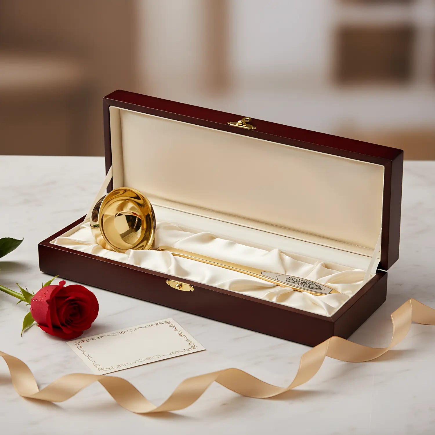 Bewahre die Kelle im Geschenketui oder in einem weichen Silbertuch auf. Vermeide Feuchtigkeit und chemische Reiniger. Durch regelmäßige Pflege bleibt der goldene Glanz und das dunkle Niello-Muster dauerhaft erhalten.