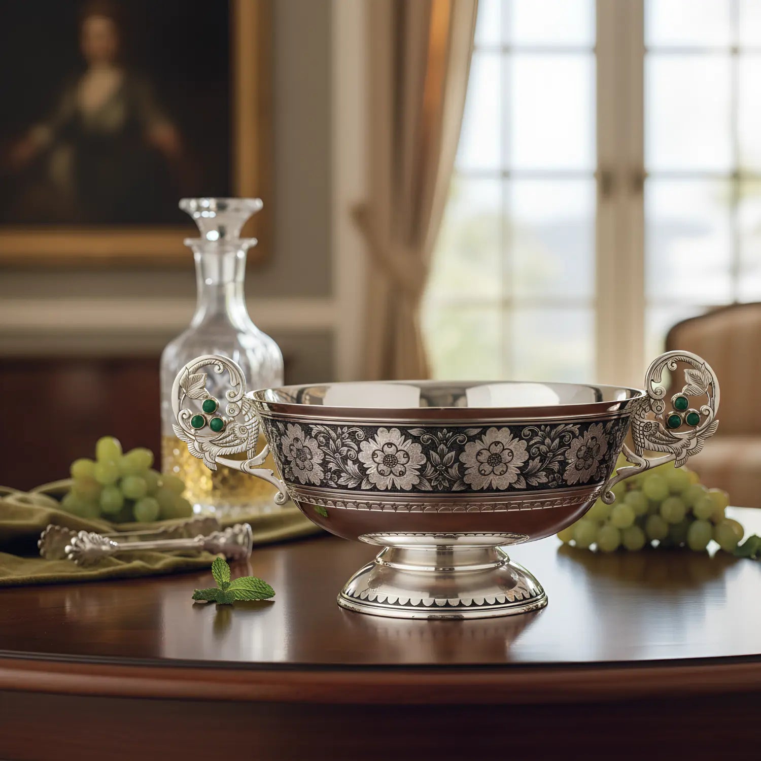 Die Silberschale „Für Zwei“ aus 925 Sterling Silber vereint kunstvolle Handgravur, Niello-Technik und edle Chrysopras-Edelsteine zu einem Meisterstück. Die breite Blütenbordüre entsteht in reiner Handarbeit, jede Linie wird einzeln gestochen, bevor das Niello eingebracht und poliert wird. Die beiden filigran gestalteten Griffe – inspiriert von mythischen Vogelgestalten – tragen jeweils drei grün leuchtende Chrysopras-Cabochons und verleihen der Schale ihre unverwechselbare Aura.