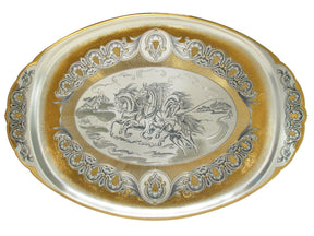 Ovales Silbertablett Troika: 925 Silber vergoldet mit handgraviertem Pferdekutschen Motiv