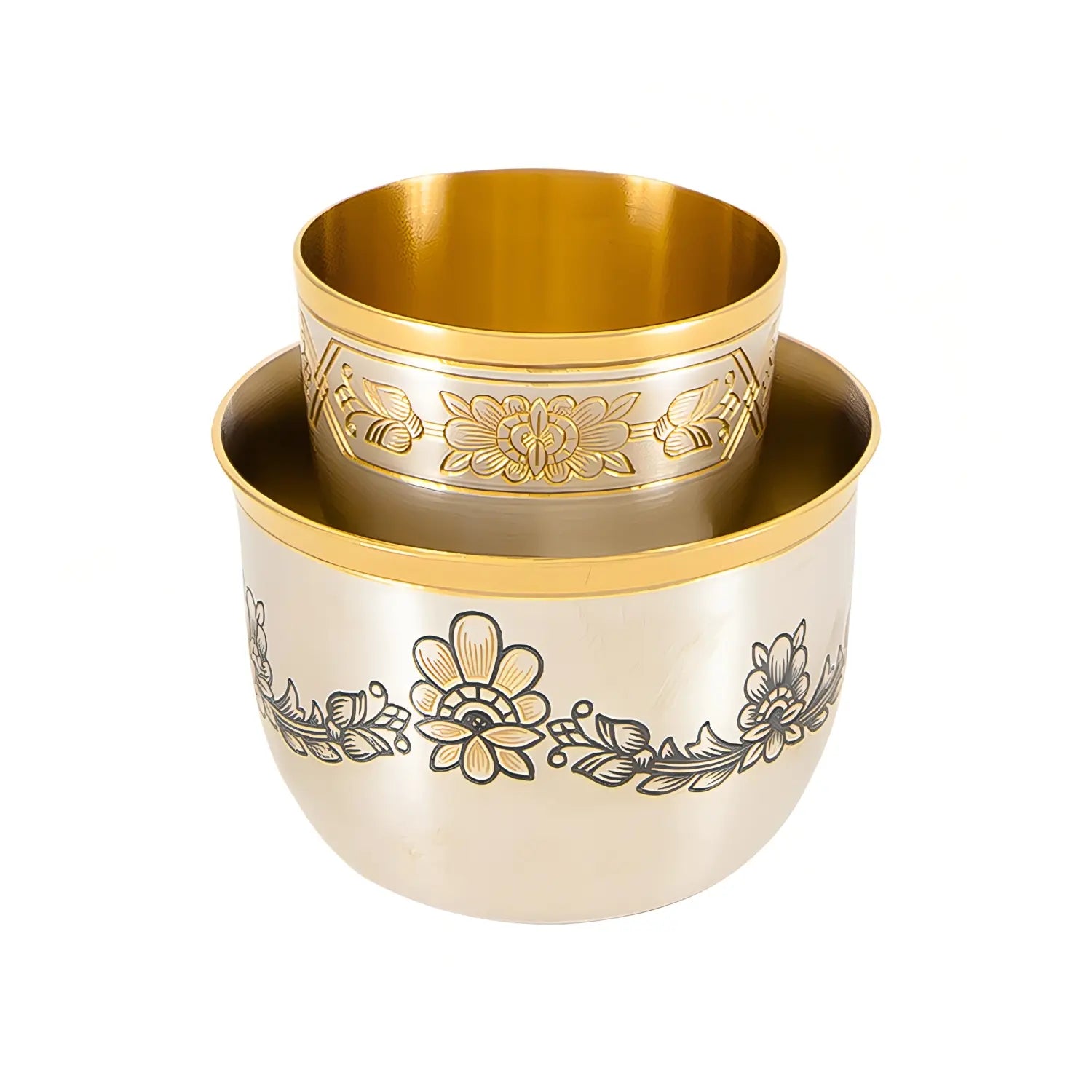 Die Kaviarschale Astra Classic besteht aus zwei perfekt aufeinander abgestimmten Schalen: Die größere Eisschale (Ø 69 mm × H 46 mm, 100 ml) bildet die Basis und wird mit Crushed Ice gefüllt. Ihr Inneres ist vollständig hochglänzend vergoldet, der obere Rand ist breit vergoldet, die Außenseite mattiert und trägt drei symmetrisch angeordnete Niello-Blumengruppen mit vergoldeten Akzent-Blumen – identisch mit der Verzierung der Karaffe, der Gläser und des Tabletts aus der Astra Classic Kollektion.