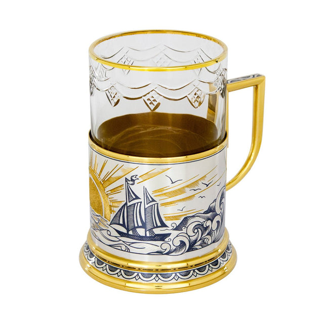 Teeglas mit Halter 925 Silber Kristallglas Segelboot