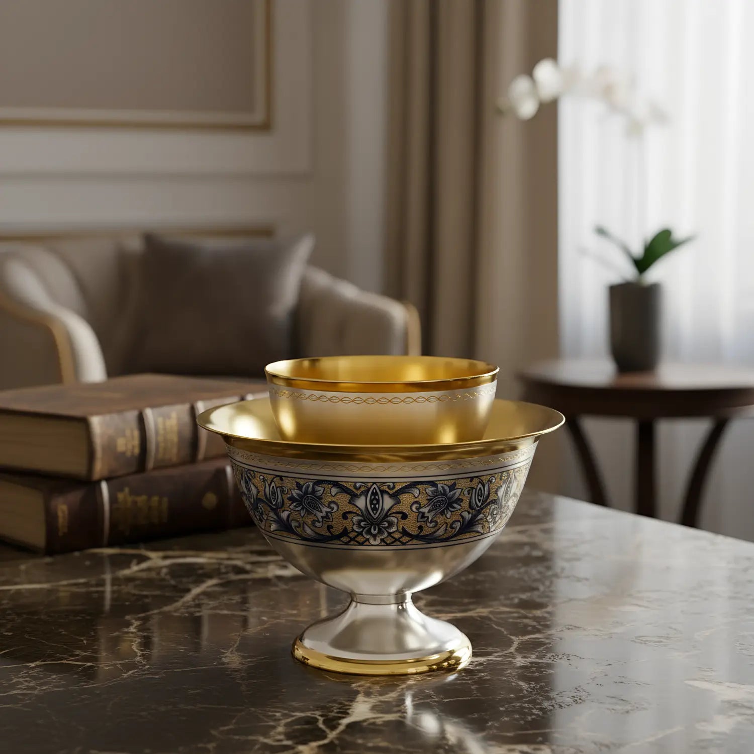 Die eindrucksvolle Kombination aus Silber, Gold und Niello wirkt sowohl klassisch als auch modern und verwandelt jede Tafel in eine Bühne für kulinarische Momente.
