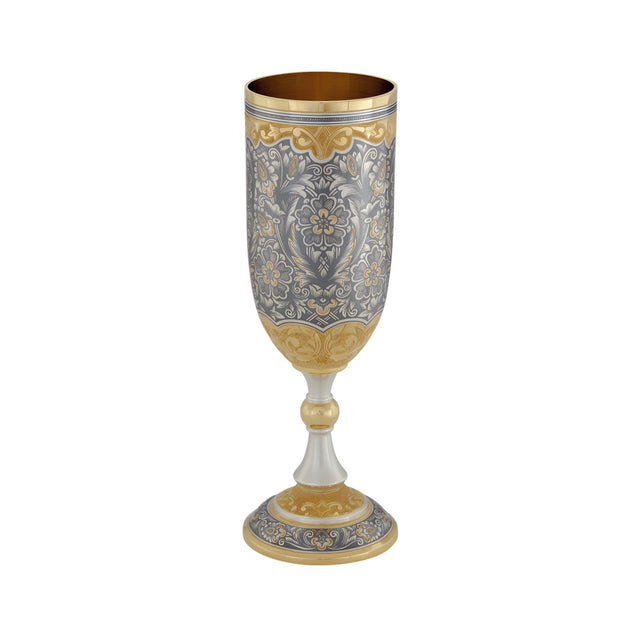 Der handgravierte Weinpokal aus 925 Sterling Silber und Vergoldung ist ein echtes Kunsthandwerk zum Verlieben. Mit seiner meisterhaften Handarbeit und der blumenartigen Verzierung aus Niello und Gold wird dieser Pokal zum unvergesslichen Sammlerstück und einem wahren Blickfang in Ihrem Zuhause.