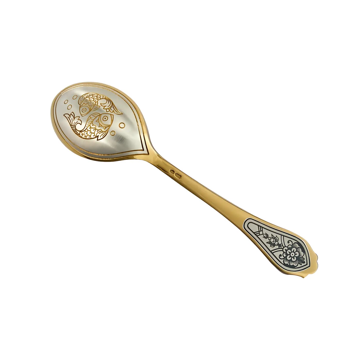 Crafted from 925 sterling silver and finished with gold plating and a unique niello pattern, this spoon is a testament to our commitment to quality and attention to detail. Each spoon is unique, crafted with great care and precision.