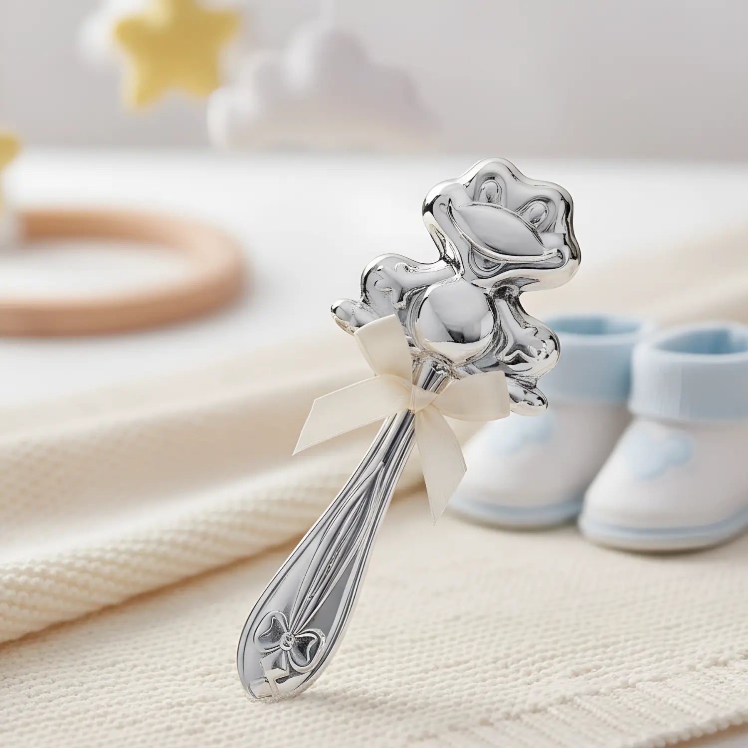 Emotional connection: The frog, as a symbol of transformation, growth, and joy of life, creates a positive emotional connection – many children develop a special relationship with their first silver rattle.