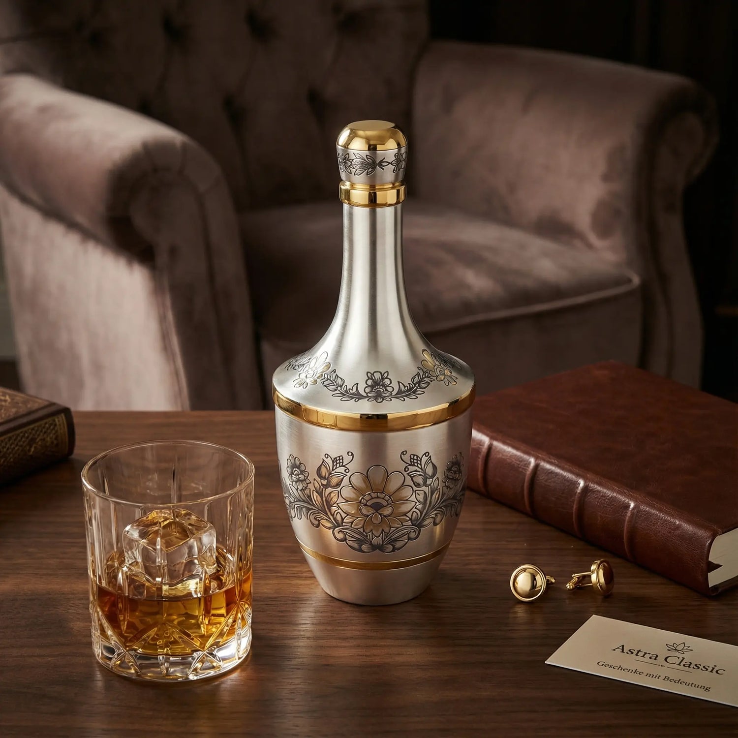 The Astra Classic liquor set is the perfect gift for those who appreciate fine spirits: for fathers on Father's Day, for colleagues on their retirement, for friends on their milestone birthday, for grooms on their wedding day, or as a thank-you gift for someone special. The set comes gift-wrapped in a high-quality case, making it immediately clear that this isn't just any glass, but a complete ensemble crafted from 925 sterling silver, hand-engraved, and from a manufacturer with over 100 years of tradition.