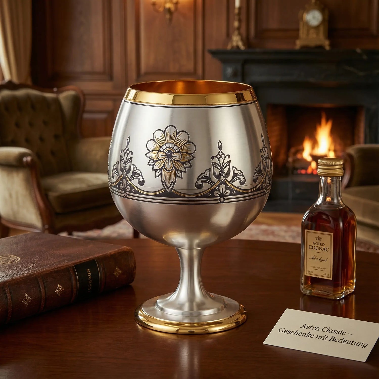 The Astra Classic 4-piece liquor set is the ultimate gift for those who appreciate fine spirits of the highest quality: for fathers on milestone birthdays, for colleagues on their retirement, for business partners on anniversaries, for couples on their golden wedding anniversary, or as a premium gift for someone special. The set comes gift-wrapped in a high-quality case and immediately conveys that this is not just a single glass, but a complete ensemble crafted from 925 sterling silver, hand-engraved, with a tray, and from a manufacturer with over 100 years of tradition.