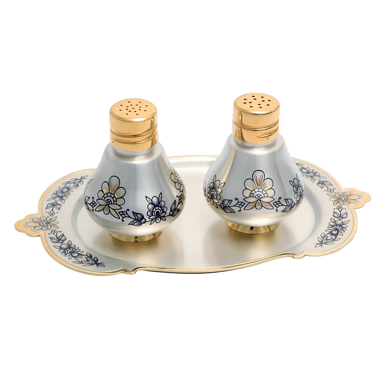 Yes, all three pieces of the set can be personalized. Upon request, we can engrave names, dates, initials, or a personal message on the shakers (frosted exterior between the niello floral band) or on the tray (frosted center or underside). The engraving is professional and permanent. This personalization makes the set a unique gift for weddings, housewarmings, or as a thank-you present – for example, "Sarah & Tom · 2025" or "For the Wedding · With Love." An engraved salt and pepper shaker set is a gift that will be used and cherished every day. Simply contact us with your engraving request!
