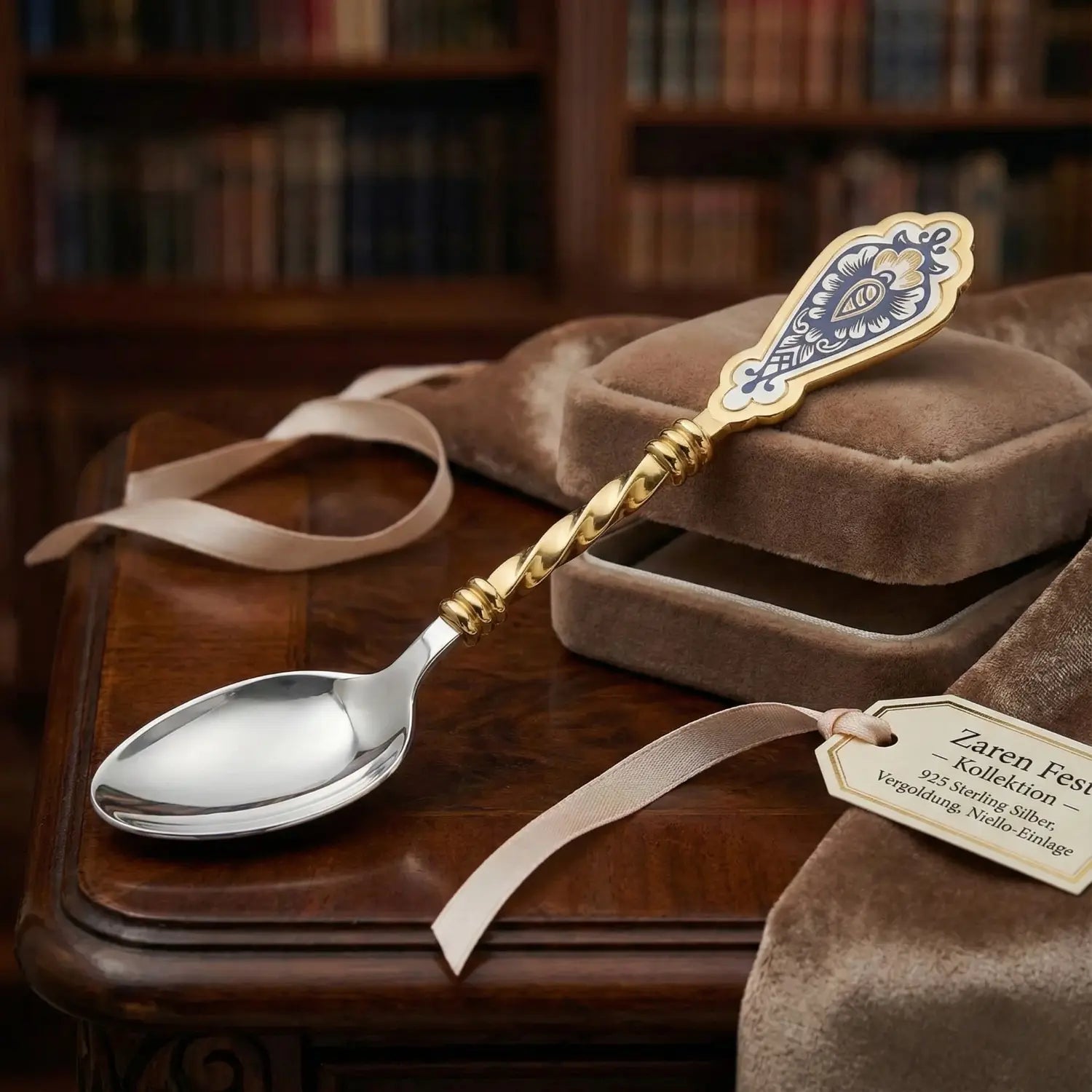 The "Tsar's Feast" teaspoon exemplifies how traditional silversmithing can be transformed into a modern luxury object. Every detail is handcrafted: the bowl made of solid 925 sterling silver , the elegantly twisted handle, the warm, lustrous gold plating , and the intricate niello ornamentation at the end of the handle. A spoon that is far more than a utensil – it is a small work of art.
