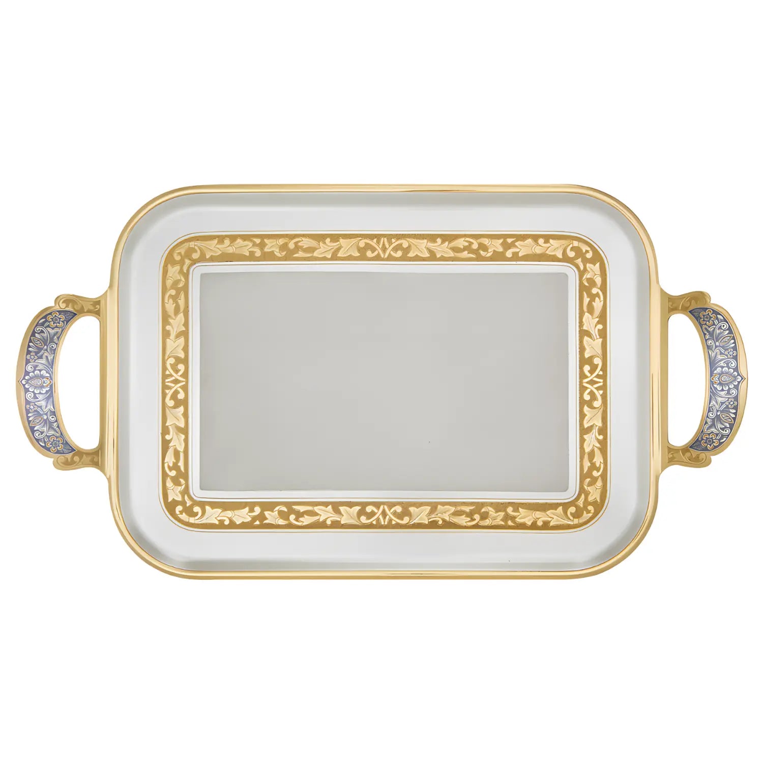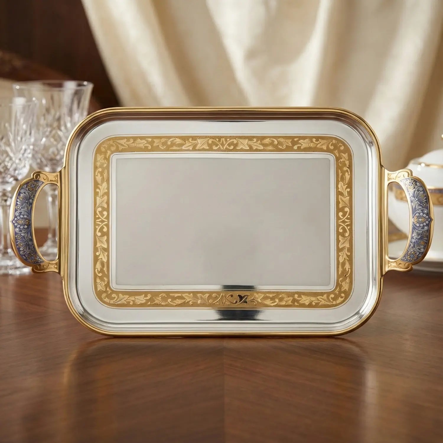 • Silver tray: elaborately engraved panels and handle areas, gilded border