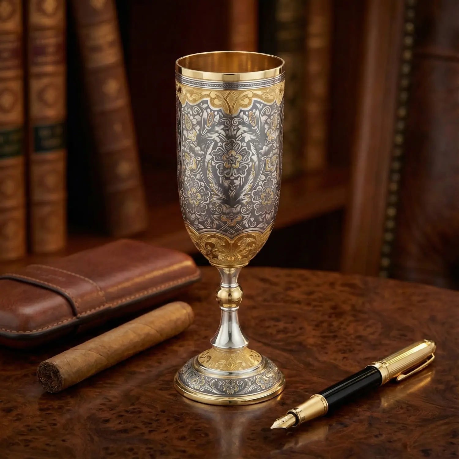 The 925 silver gold-plated wine goblet from the Tsar's Feast Collection is a work of art that translates the aesthetics of historical court culture into the modern world. Slender, dignified, and richly decorated, it combines solid silver, warm gold plating, and hand-applied niello to create a glass that enhances moments without ever being ostentatious.
