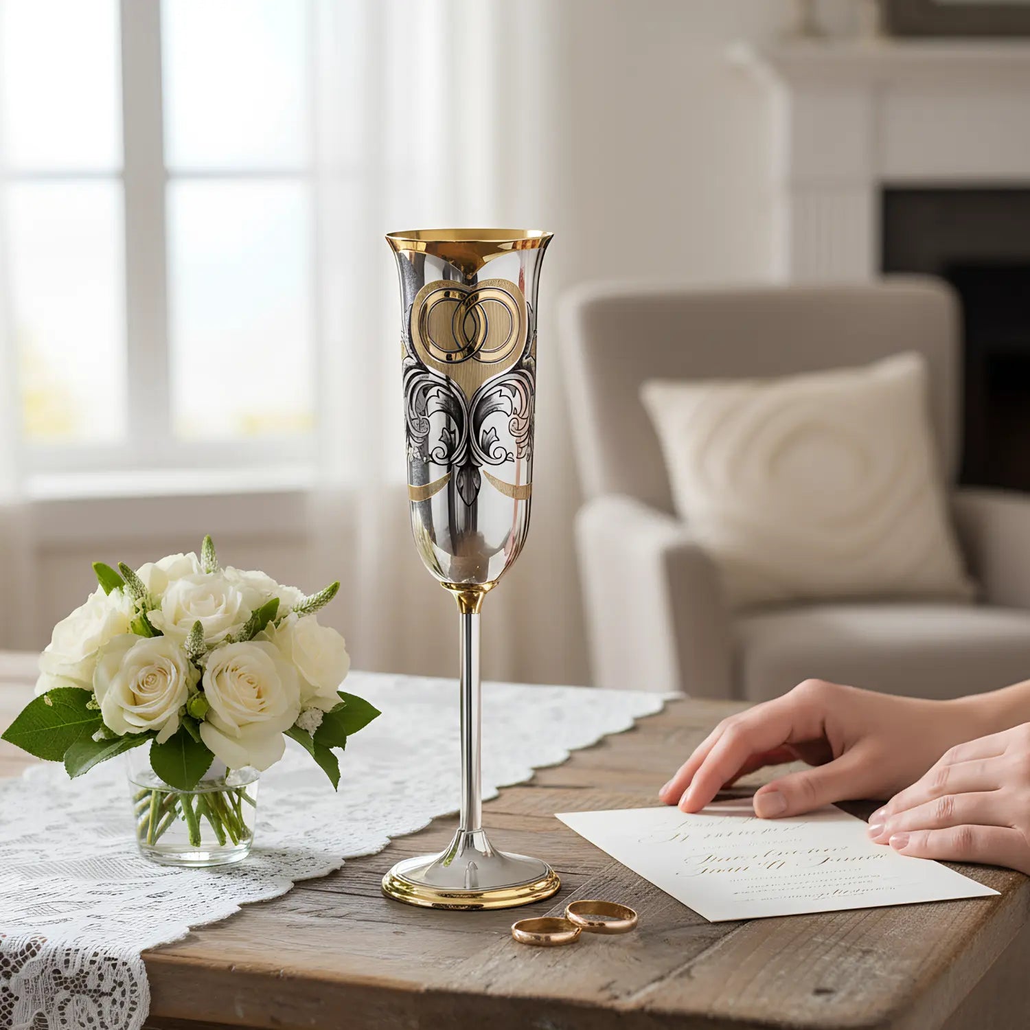 Silver is ideal for engraving. You can engrave names, a good wish, or simply the date of the celebration. The witnesses can have the champagne flutes engraved with their names and birthdays or the wedding date. The bride and groom can then toast with this champagne flute.