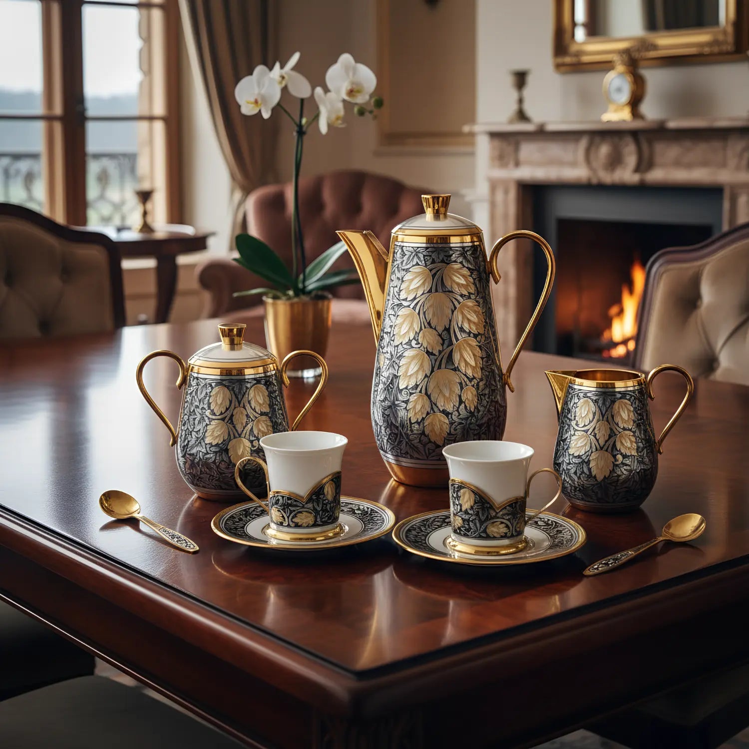 Каждый предмет набора был тщательно изготовлен вручную и отличается точной ручной гравировкой и уникальным дизайном с изображением хмеля. Сочетание традиционного мастерства и современной эстетики придает этому чайному сервизу непреходящую элегантность, которая украсит любой кофейный или чайный столик.