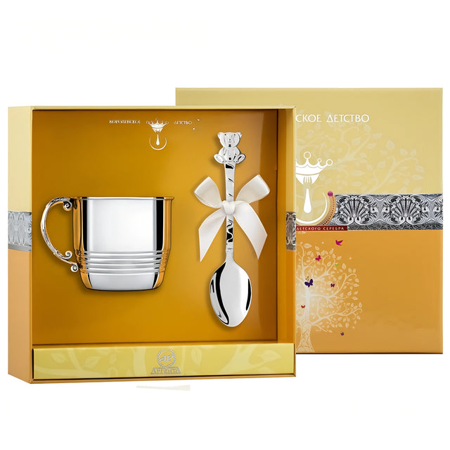 Эксклюзивный подарочный набор представляет собой идеальное сочетание роскоши и функциональности. В комплект входит стильная детская чашка с ручкой и соответствующая ей детская ложка. Оба изделия тщательно изготовлены из стерлингового серебра 925 пробы и украшены очаровательным рисунком плюшевого мишки, который понравится как мальчикам, так и девочкам.