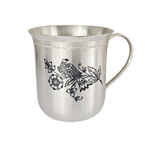 Элегантный сосуд для питья имеет емкость 230 мл, круглую форму, которая расширяется кверху, и украшен вручную черневыми рисунками и гравированными орнаментами. Продолжая тему «летнего сада», можно увидеть птицу, цветы и листья.